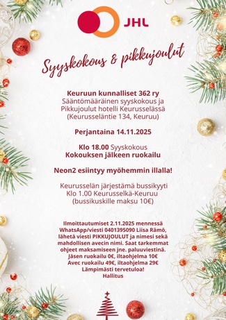 JÄSENEDUT VUODELLE 2025Keuruun kunnalliset JHL 362 ry & Keuruun uimahalli Keuruun kunnalliset Jhl 362 Ry:n kaikilla jäsenillä on oikeus käydä Keuruun uimahallissa/kuntosalilla 4 krt kalenterikuukaudessa. Ei ole väliä mihin kohtaan kuukautta käynnit sijoittuvat eli voit käydä vaikka 4 krt viikossa, kunhan et sinä kuukautena käytä etua muina viikkoina. Tarkemmat ohjeet toimitettu jäsenten ilmoittamiin sähköpostiosoitteisiin, ohjeet luettavissa myös uimahallilla!